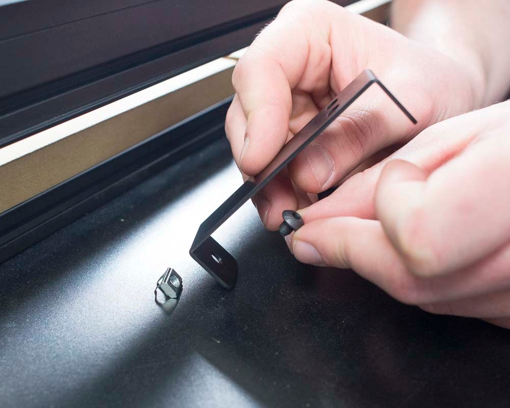 Place an M5x14 button head screw through the hole in the plastic support arm and thread it onto the end of the 1000mm extrusion. Repeat this process for the other side and tighten the screws with a 3mm hex key.