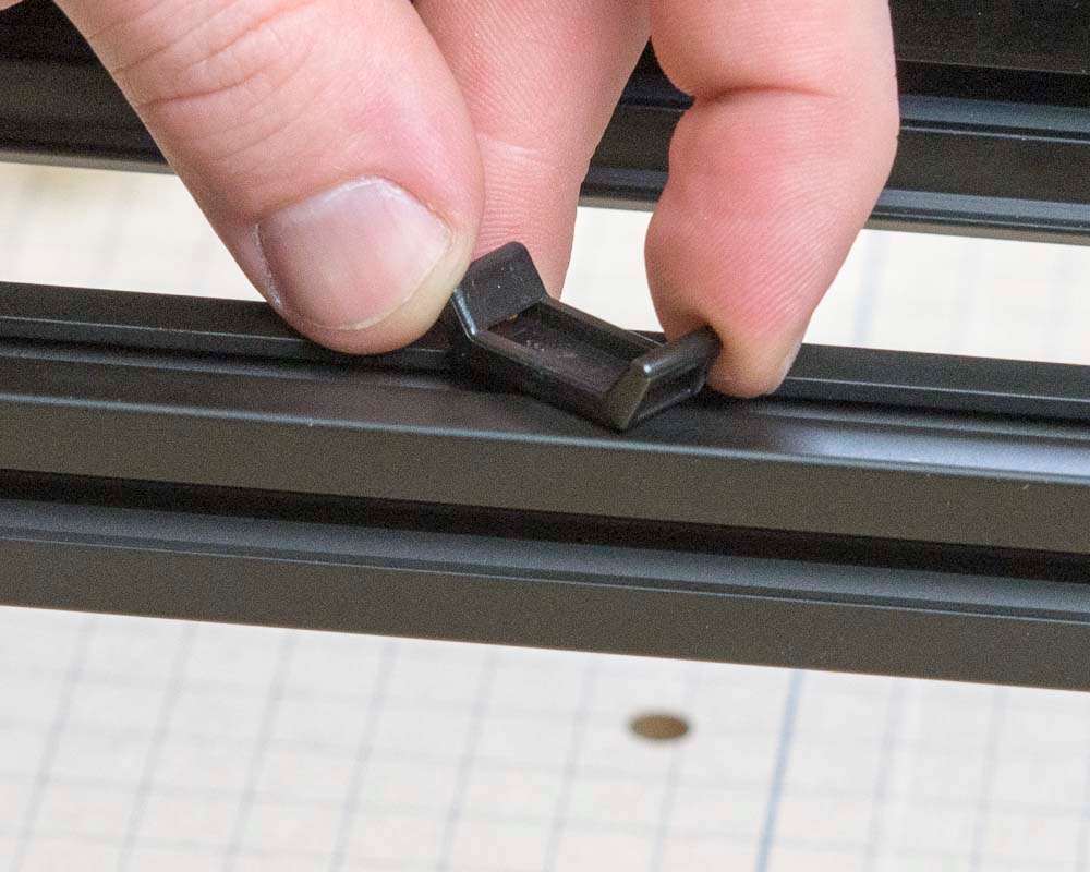 The zip tie mounts are placed with the tee nut shape in the extrusion and then twisted into place. You can also use the open end of the 10mm wrench from your toolkit to easily rotate them.