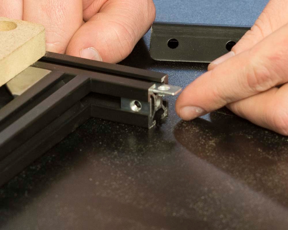 Insert 2 pre-assembly t-slot nuts on the side of each aluminum extrusion (facing inward). These will be used to attach the gusset brackets to the extrusions. Insert 1 additional pre-assembly t-slot nut on the top side of one of the 958mm extrusions to match up with the middle countersunk hole on the sideboard.